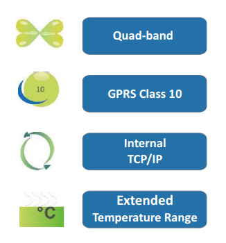 All these features and interfaces are easily controlled and configured using a versatile AT command interface that provides full control over the G510 operation. The G510 control and indication interface extends its capabilities beyond GSM communications. This includes a regulated output voltage for supplying external circuits. With these interfaces, the G510 can operate and control external applications and receive feedback from external environment and circuits.