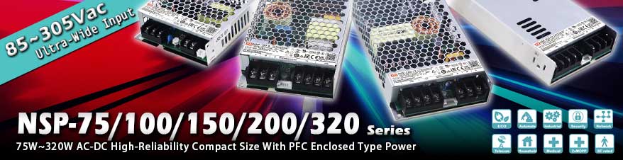 Серії RSP-75/100/150/200/320 від MEAN WELL присутні на ринку джерел живлення вже понад 10 років, і за цей час було продано понад 10 мільйонів одиниць цих перетворювачів. Вони мають широке використання в системах промислового керування, комунікаційному обладнанні, архітектурному освітленні, системах безпеки та протипожежного захисту. В цьому році MEAN WELL зробив крок вперед та розпочав серійне виробництво покращених серій NSP-75/100/150/200/320.