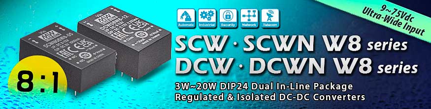 DC/DC-перетворювачі потужністю 3-20 Вт від MEAN WELL серій SCWN03, SCWN06, SCW08, SCW12, SCW20 з одним виходом та DCWN03, DCWN06, DCW08, DCW12 з двома виходами, вже багато років успішно застосовуються у найрізноманітніших галузях. Завдяки щорічним продажам у сотнях тисяч одиниць ці перетворювачі заслужили довіру в енергетичних системах, вимірювальних приладах, телекомунікаційному обладнанні, промисловій автоматизації, IoT-рішеннях та інших сферах.