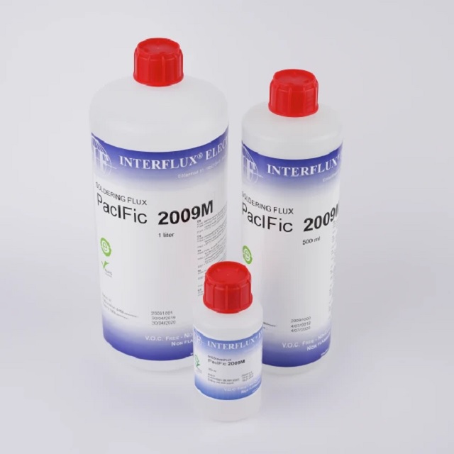 Interflux PacIFic 2009M - рідкий, не вимагає відмивання (No clean), флюс на водній основі з низьким вмістом твердих речовин (3,7%) і не містить галогени. OR L0 згідно стандартам EN і IPC.