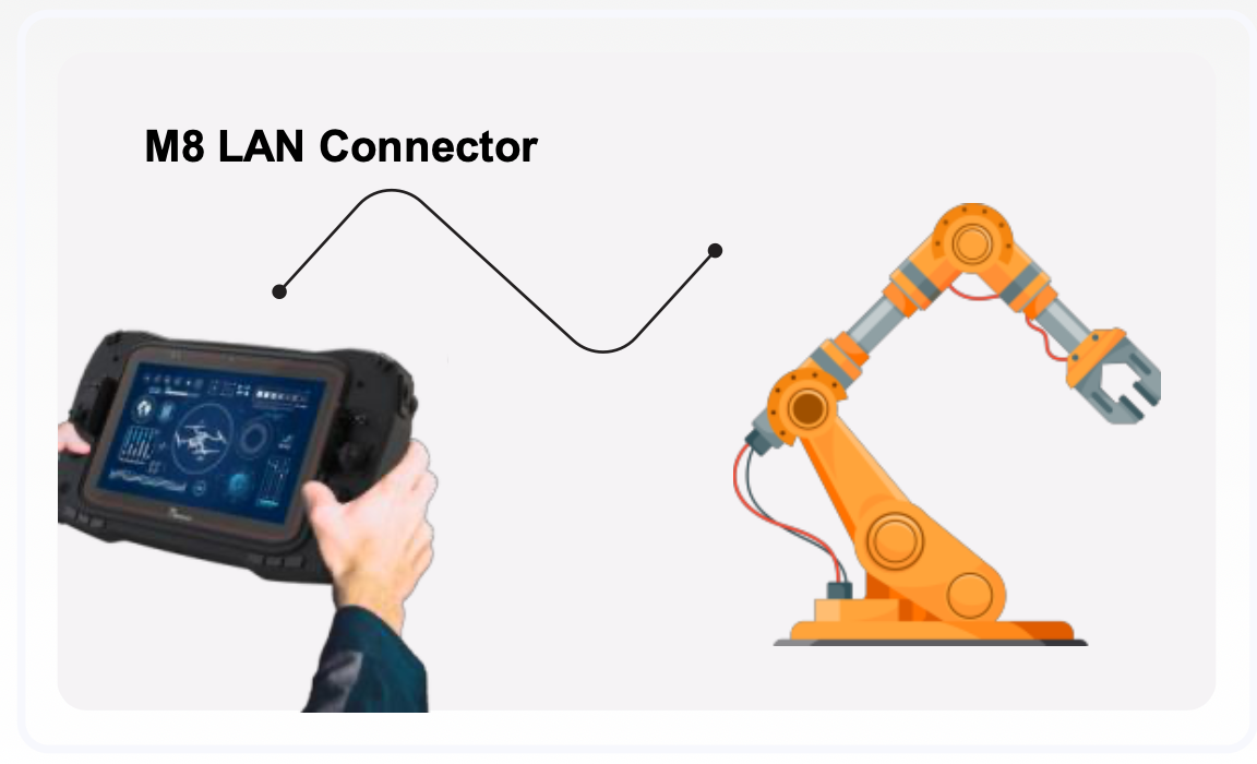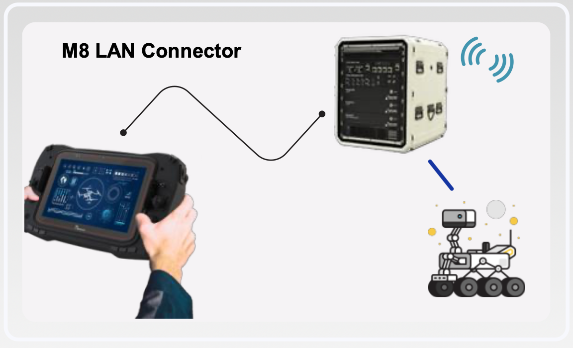 Этот метод использует тот же самый прочный LAN-порт M8, но подключается непосредственно к работе, минуя любые беспроводные настройки. Это проводное соединение является надежным, устойчивым к помехам и хорошо подходит для стационарных роботизированных систем, таких как промышленные манипуляторы или наземные беспилотники (UGV), работающие в контролируемой среде.